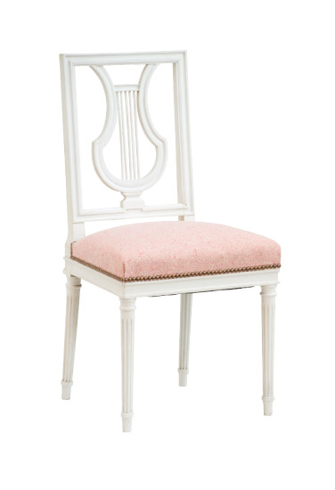 Pink upholstered dining chair with white painted finish. 631.273.8800 | duralee.com