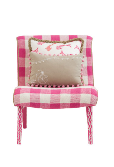 One hundred percent cotton handwoven in Nepal Kilim covered chair designed by Custom Cool as part of their new 2014 collection with more than 100 coordinating designs. Pink + white, GoodWeave Fair Trade Certified. Assembled in the U.S. 516.652.6154 | customcoolrugs.com