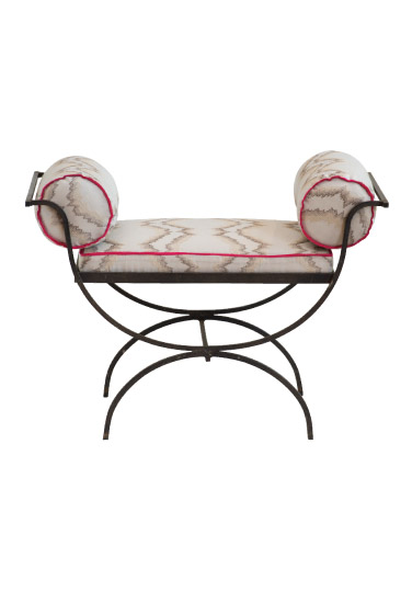 Wrought iron stool with linen and silk seat cushion and two Bolsters. In shades of gray and hot pink. 631.367.3816 | kimweiss.com