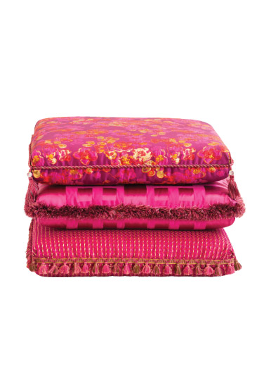 Three coordinating floor cushions – 30” x 30” square in fuchsia and metallic patterned fabrics with decorative trimming. 631.868.0595 | kimecourtneyinteriors.com