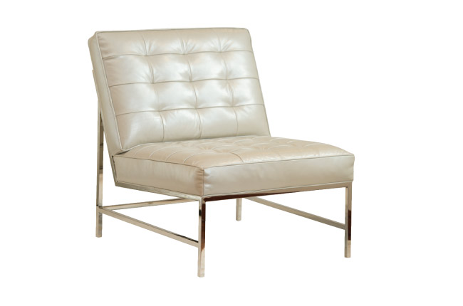 Mid-century modern armless chair with sleek metal base and grid tufted cushions. Silver, full-grain, full-aniline metallic leather. 516.726.2850 | mgbwhome.com
