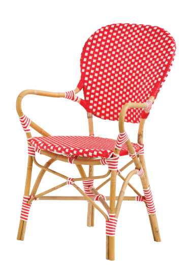 Riviera arm chair in Poppy, a classic 1930s European bistro chair, reinterpreted. Made of sustainable rattan and woven plastic. 415.331.4746 | serenaandlily.com