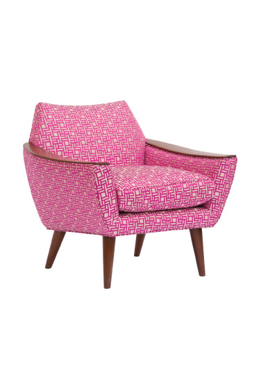 Vintage mid-century club chair, upholstered by classic upholstery in Lanza Jaipur geometric pink fabric. 203.661.1266 | amyhirsch.com