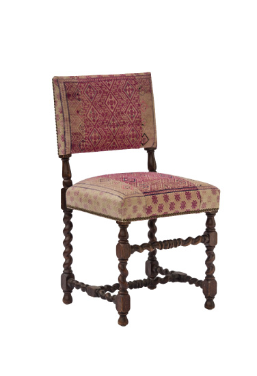 Antique Bobbin chair from Belgium, upholstered with a stunning hand-woven textile from Zhuang, China. Detailed with elaborate geometric patterns and flowers. 203.227.4406 | bungalowdecor.com