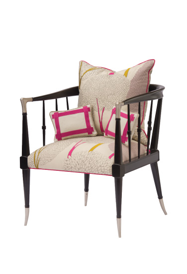 Occasional chair, black-laquered with brushed nickel tipped arms and legs, curved, rounded back with open spindles, upholstered seat with loose cushion back, additional lumbar pillows. 203.762.2888 | sheridaninteriors.com
