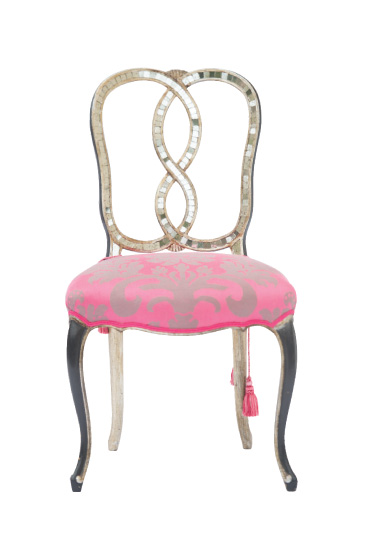 Mosaic-mirrored Italian-style side chair with upholstered seat in Schumacher #68434 Anna Damask color: Fuchsia/Gray with French double weiting and chair tassels from Samuel & Sons Passementerie. 203.454.5557 | suzannenovikinteriors.com