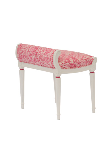 Custom upholstered bench in Kelly Wearstler pink/gray fabric. 203.645.1561 | bella-interiors.com