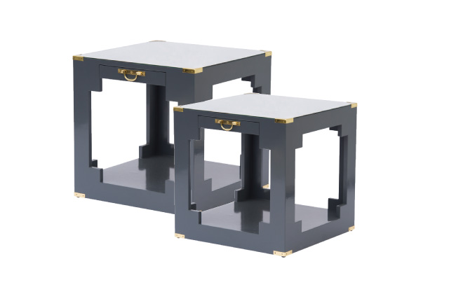 “Paris Low Side Tables” custom-made, hand-painted, mirror-topped with brass corner hardware. 203.226.8777 | hbhome.com