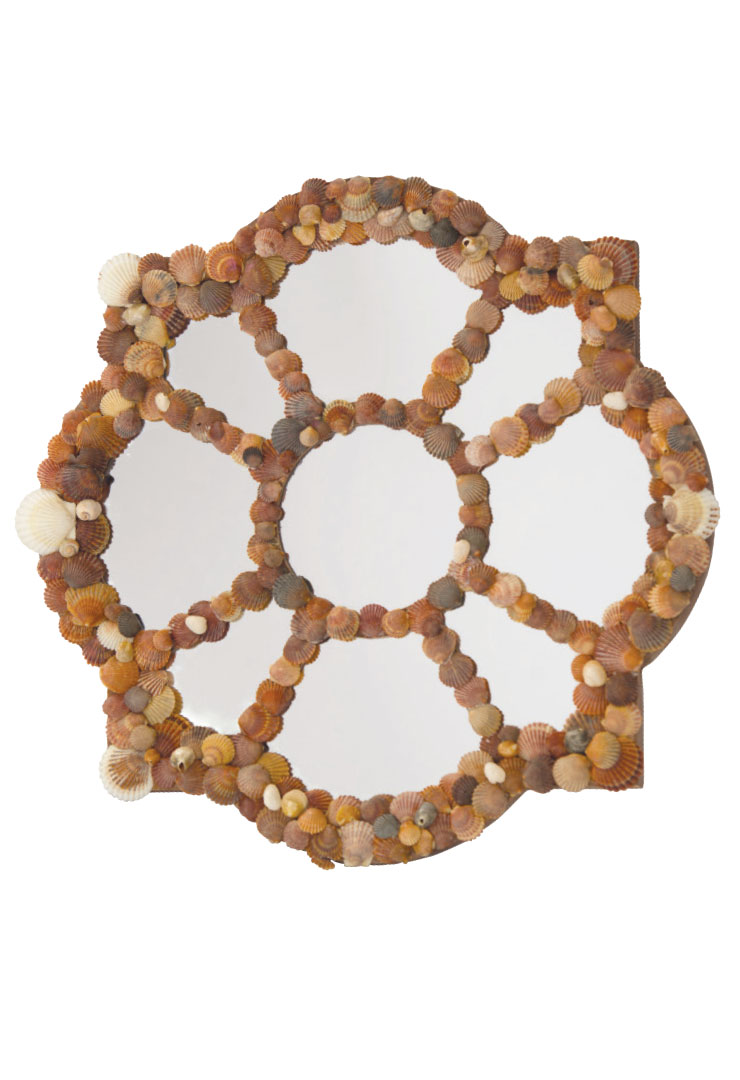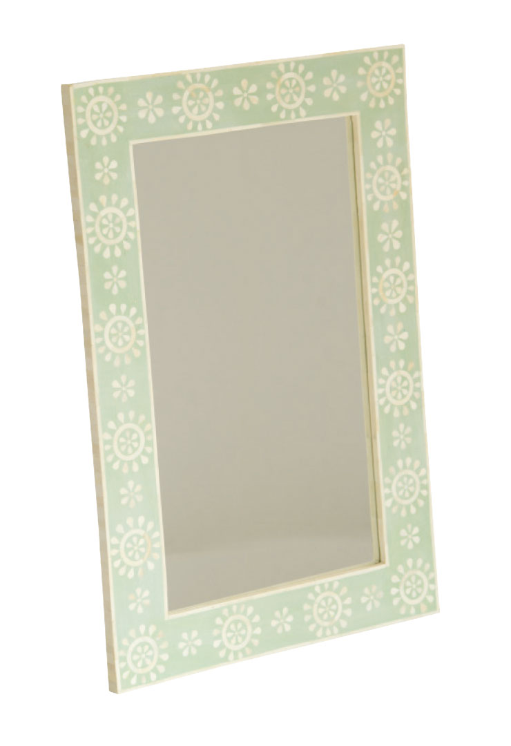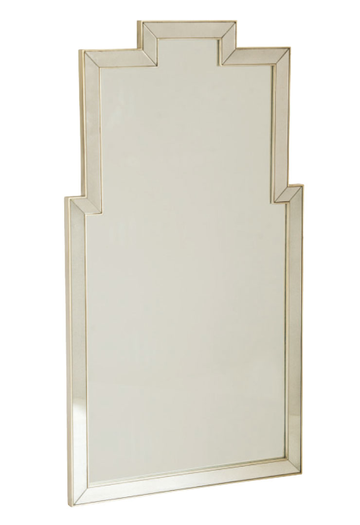 Mirrored glass with a beveled, lightly antiqued mirrored framing and aged silver wood trim. lillianaugust.com