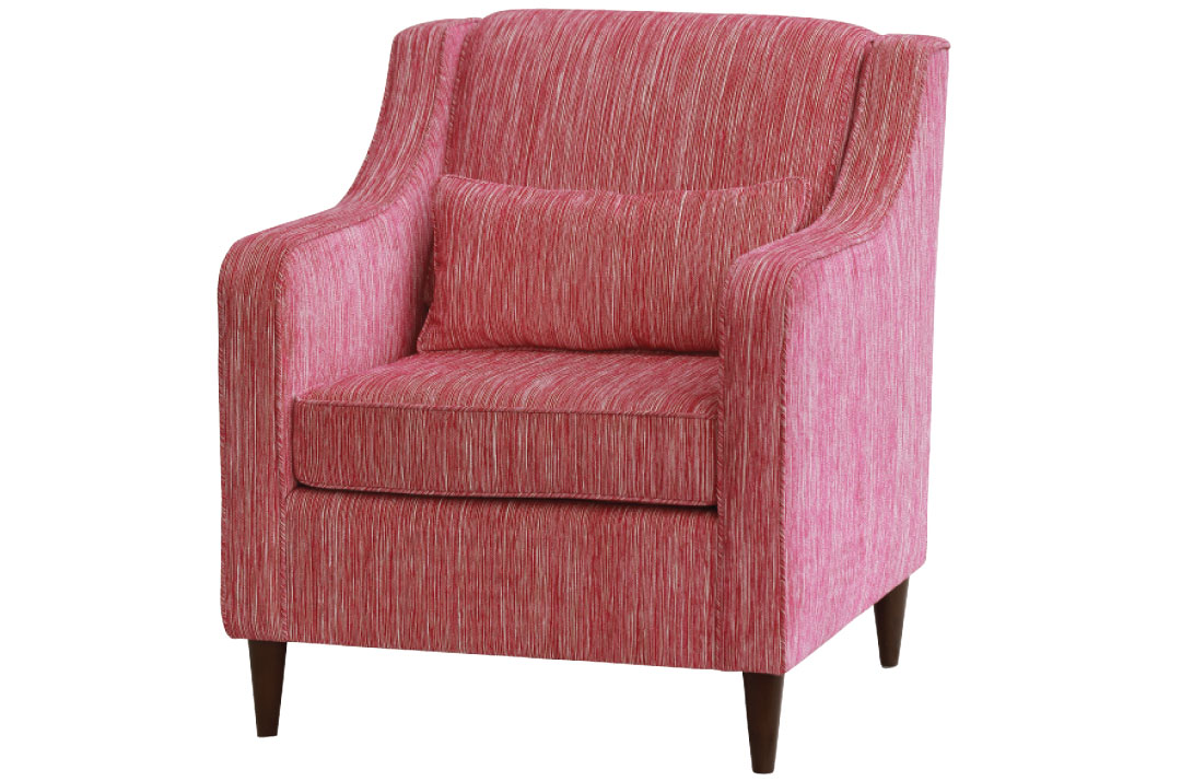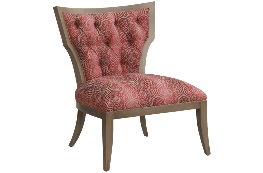 Wood framed upholstered occasional chair with tufted back, front covered in Eileen Kathryn Boyd’s fabric for Duralee. ekbinteriors.com