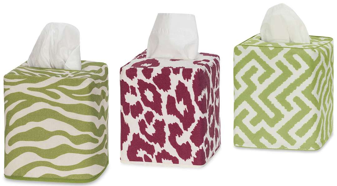 A chic upgrade for cold season, fabric covers from the Matouk Schumacher collection turn even tissues into décor. Available in a variety of prints and patterns.