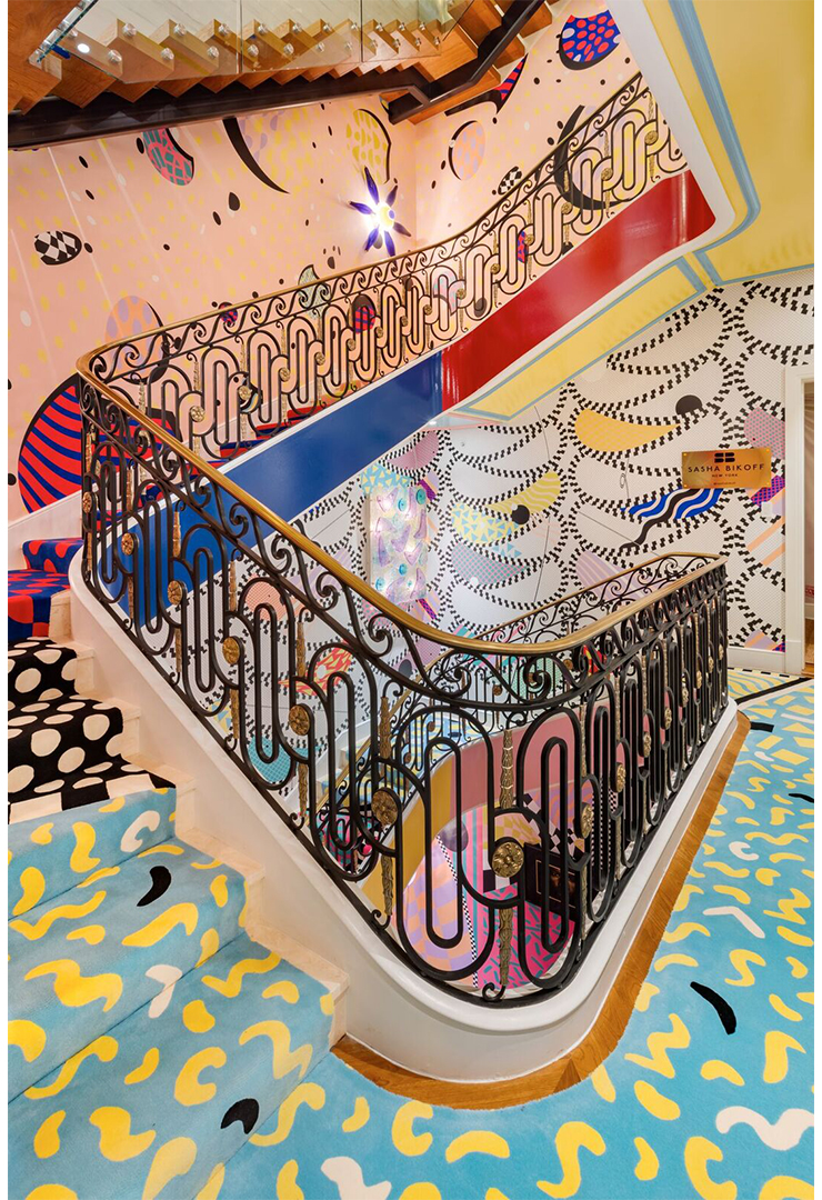 Sasha Bikoff uses bright wallpaper, paint and rugs to create a bold staircase, making a bold splash in a space that is often overlooked while Scott Sanders, LLC. uses bronze accents to turn a powder room into a jaw-dropping space.