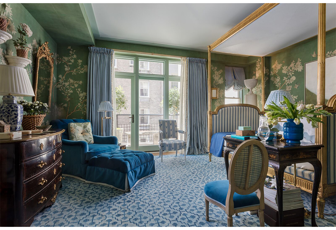 Mark D. Sikes Interiors shows off how different patterns in muted colors can work together in one bedroom while Juan Montoya Design uses big, bold patterns on the walls, window coverings and floor to create a beautiful statement.