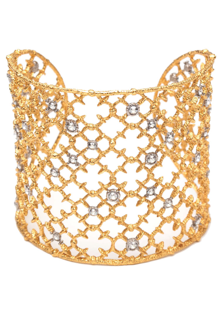Lace cuff in oxidized yellow-gold plate and pavé crystals by Alexis Bittar for Jennifer Miller, $245, at Jennifer Miller Jewelry, 28 Jobs Ln., #C, Southampton, 631-283-9061.