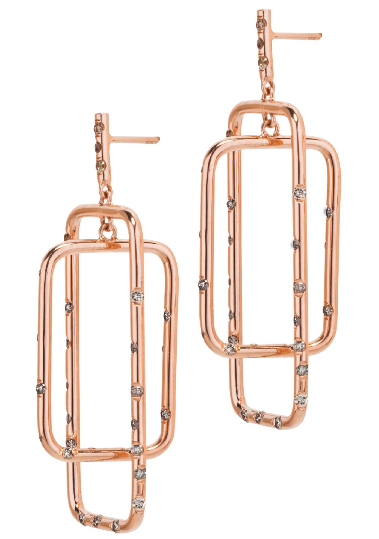 LJ Cross Mobile earrings in 14k rose gold with Champagne diamonds, $4,800 for the pair, at Copious Row, 27 Washington St., Sag Harbor, 631-808-3600.