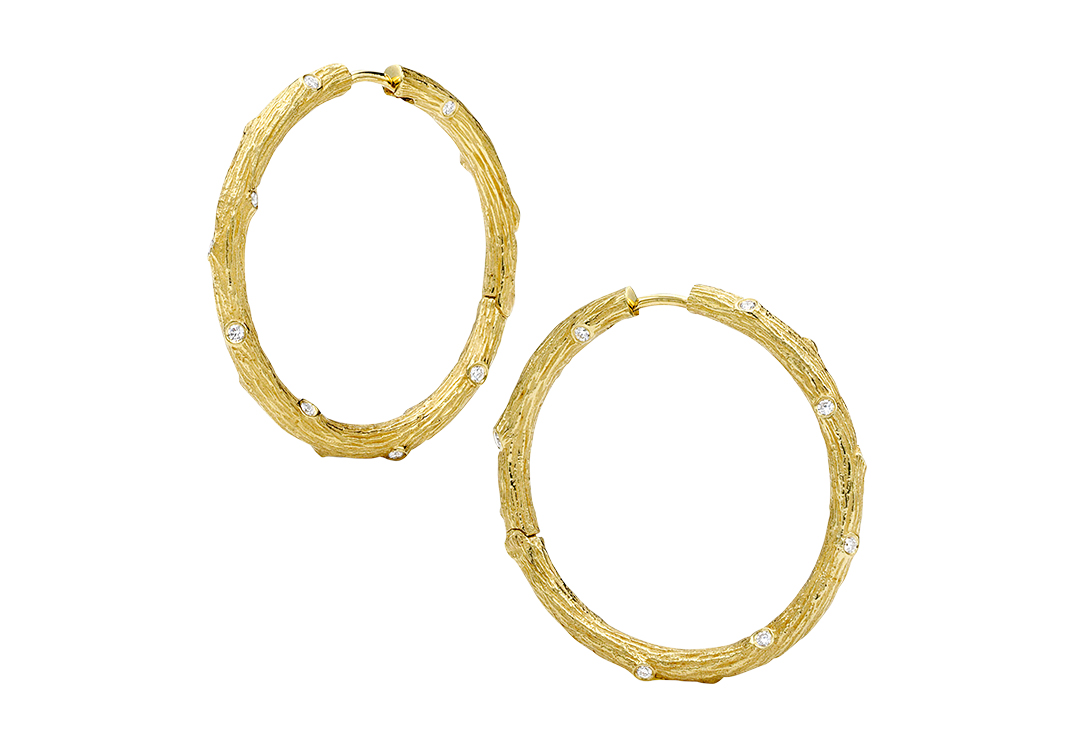 Twig earrings in 18k yellow gold with diamond accents, $5,900, Mish New York, 30 Bond St., NYC, 212-734-3500, mishnewyork.com.