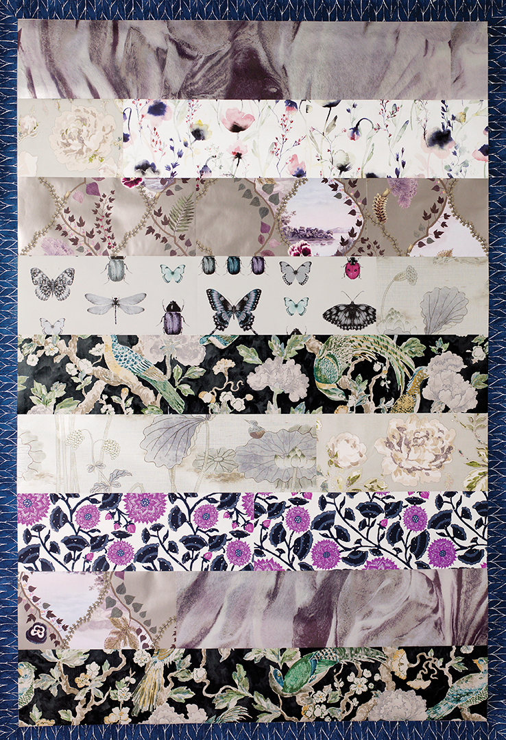 The Wallpapers: The natural world inspired the design of this horizontal-bar design in iridescent shades of pink, purple and gray. 1. Rope, Clay McLaurin Studio 2. Geode, Innovations 3. Mottisfont, Madeaux by Richard Smith 4. Lo, Sandberg 5. Coup De Vent Cuivre Source, Christian Lacroix for Designers Guild 6. Papilio, Clarke & Clarke 7. Aviary, Madeaux by Richard Smith 8. Treasure Flower, Colefax & Fowler 9. Jaipur, Peter Fasano.The Quilt Pattern: “Amish Bar quilts are famous for their basic bar construction. Here, the size of the patterns determined the size of the bars.”