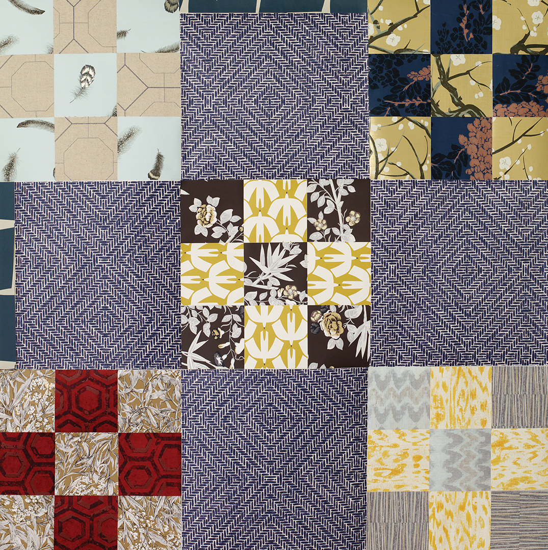 The Wallpapers: A classically simple design of nine-patch squares is fashioned in a traditional color palette of colonial blues, ochres, golds and reds. 1. Plumis, Clarke & Clarke 2. Roma, Colefax & Fowler 3. Rattan, Clay McLaurin Studio 4. Flower Quince, Clarence House 5. Wisteria, Farrow & Ball 6. Ginto, Jane Churchill 7. Carlotta, Thibaut 8. Shiva, Cowtan & Tout 9. Revivals, Élitis 10. Malin, Sandberg 11. Jardine De Chine, Scalamandré 12. Pajaro, Scion. 13. Moqui, Scion.The Quilt Pattern: “Traditional Nine Patch is one of the more traditional quilt patterns that you see out there. It is made up of nine patch squares, within a nine patch. I did this one in a more traditional color palette of Colonial blues, ochres, gold and reds.”