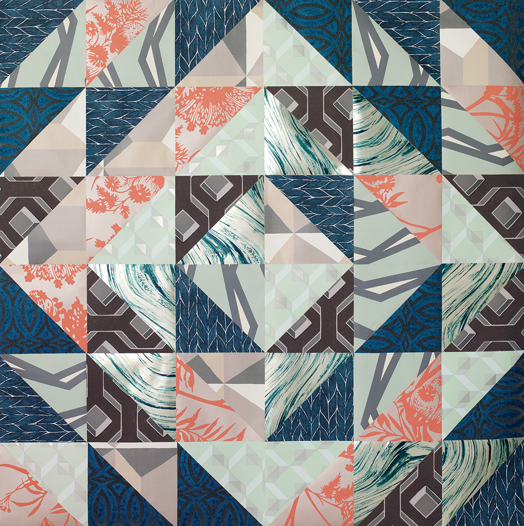 The Wallpapers: Geometric prints in bright teals, aqua and hot pink are combined with metallics for a Pop-art design within a design. 1. Rope, Clay McLaurin Studio 2. Rayo, Scion 3. Bavero, Harlequin 4. Ilse, Sandberg 5. Dufrene, Designers Guild 6. Martello, Thibaut 7. Agata, Clarke & Clarke 8. Chareau, Designers Guild.The Quilt Pattern: “Piece Triangles started with using a lot of the geometric prints that I felt spoke to each other. The other driving factor on this one was grouping the aquas and teals together. I specifically used the really hot pink metallic one as a random odd ball, so there places where the hot pink metallic functions as a dark and sometimes as a light—it was meant to move your eye across the piece.”