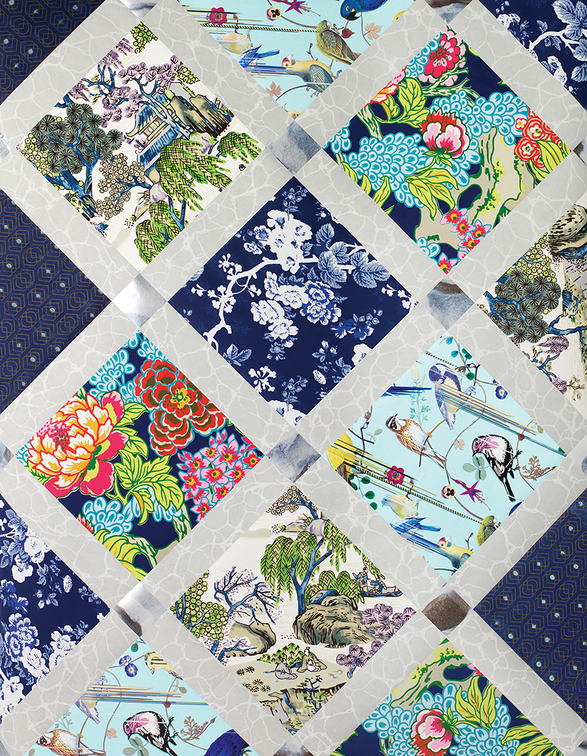 The Wallpapers: Large-scale florals, birds and chinoiserie wallcoverings are set on the diagonal in this dramatic quilt. The disparate motifs are unified with a neutral sashing and metallic squares. 1. Aladin, Élitis 2. Amato, Thibaut 3. Asian Scenic, Thibaut 4. Birds Sinfonia Source, Christian Lacroix by Designers Guild 5. Geode, Innovations 6. Honshu, Thibaut 7. Ascot Floral Print, Scalamandré.The Quilt Pattern: “Diamonds With Sashing is a really straightforward quilt. I tilted the block on the diagonal to create a diamond formation instead of a square. The sashing border goes around the block. The large-scale prints of these dramatic wallpapers necessitated a larger format.”