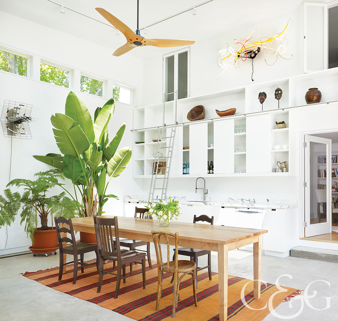 Sandy tones including a Moroccan rug, African masks, and pottery coexist perfectly within this kitchen’s white walls. The double-height kitchen allows for a banana plant and Australian tree vern to share the space, as well. (Featured in HC&G, July 2016)