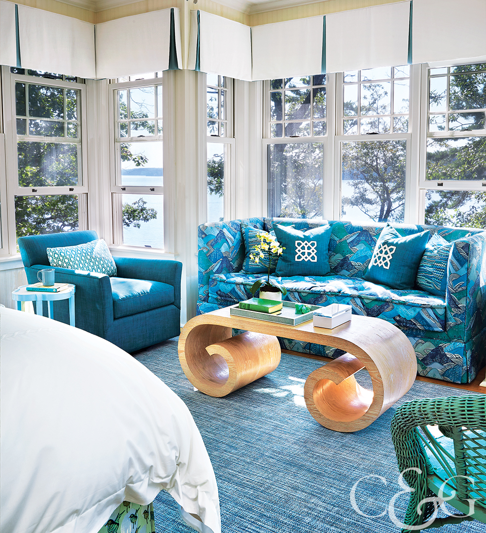 This summer getaway recreated the colors of the sea with a custom Kelly Wearstler print sofa and Savel fabric covered swivel chair. A coursed oak scroll table from Shine by S.H.O. helps mimic ocean waves. The side table is from Oomph. (Featured in CTC&G, February 2017)