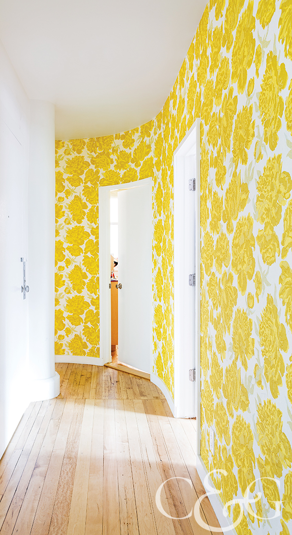 Christopher Farr Cloth’s bright yellow peonies wallpaper lines the walls, creating a hallway that radiates happiness rain or shine for this Tribeca loft. (Featured in NYC&G, March 2016)