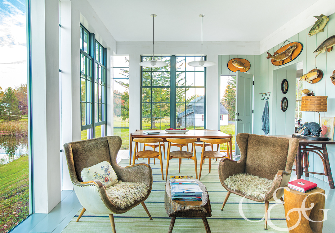 A multitude of windows, manufactured by Loewen, lead directly out onto this farmhouse property. On the walls includes the Bohl’s collection of taxidermy fish for a lakeside feel. On top of ABC Carpet & Home’s rug sits a set of Hans Wegner CH33T dining chairs and a side table resembling a tree stump. (Featured in NYC&G, March 2019)