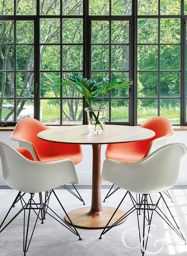Creating a minimalistic tropical vibe, coral tones contrast beautifully against the white of the chairs’ exteriors of this Greenwich home. An array of green leaves sit pleasantly on top of a modest dining table. (Featured in CTC&G, March 2018)
