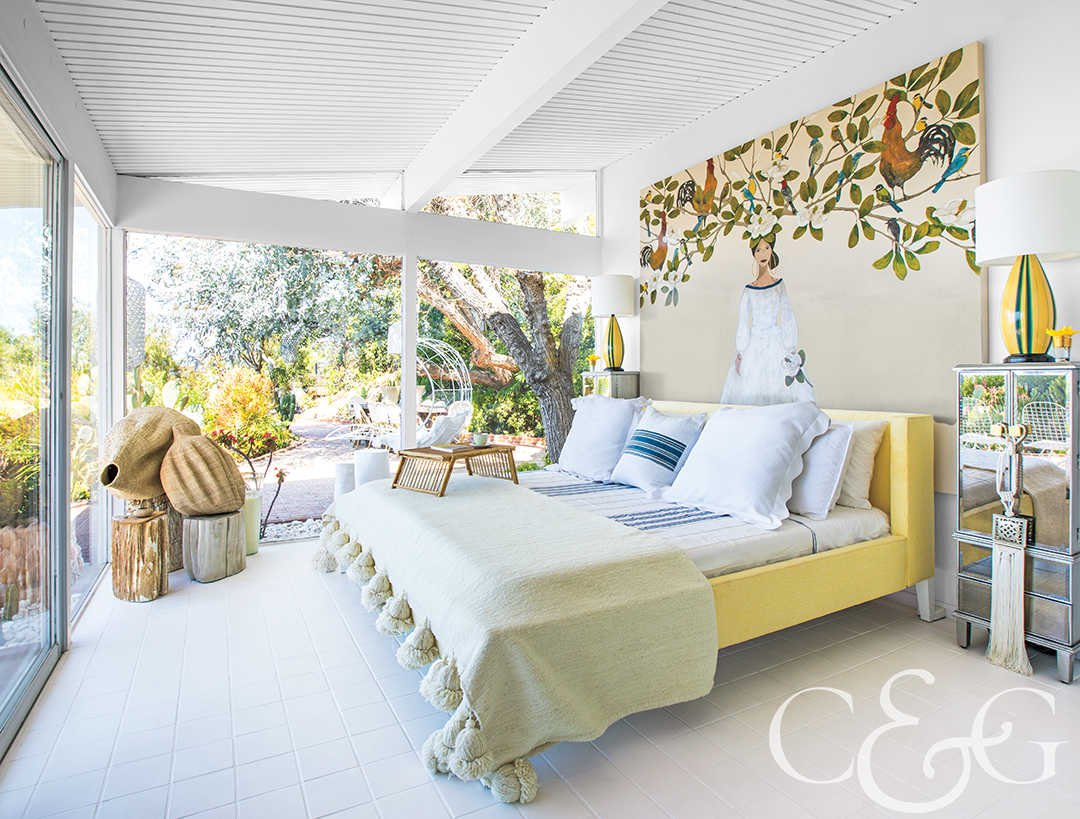 Mellow tones of yellow and green cover this Malibu home. A painting by Santa Barbara artist Erika Carter hangs as the centerpiece of the master bedroom. The bedding is Serena & Lily, topped with a Moroccan wool throw. (Featured in NYC&G, December 2018)
