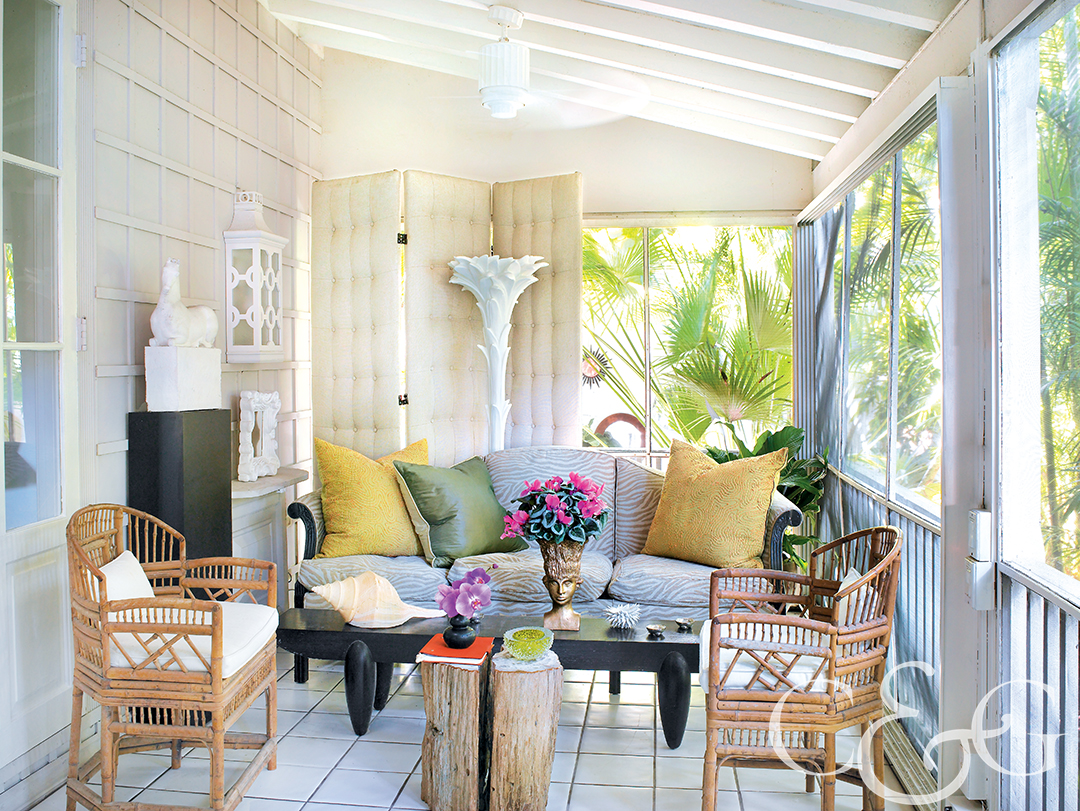 Splashes of pink, orange, yellow, and green bring energy to this Palm Beach cottage’s porch. A circa-1920 camelback sofa and 1950s bamboo, and a Holly Hunt coffee table contribute to the space. (Featured in NYC&G, November 2015)