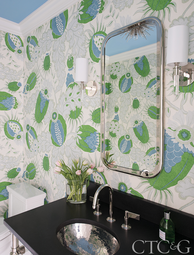 Designer Graham Veysey’s clients wanted something fun and fresh for their home. Veysey delivered with color and pattern. The wallpaper, an archival design from the ’70s, was reimagined in today’s colors. Another bold move is the bright blue ceiling. The contemporary, silver-tone hammered sink and sleek faucet balance the abundance of color and pattern.