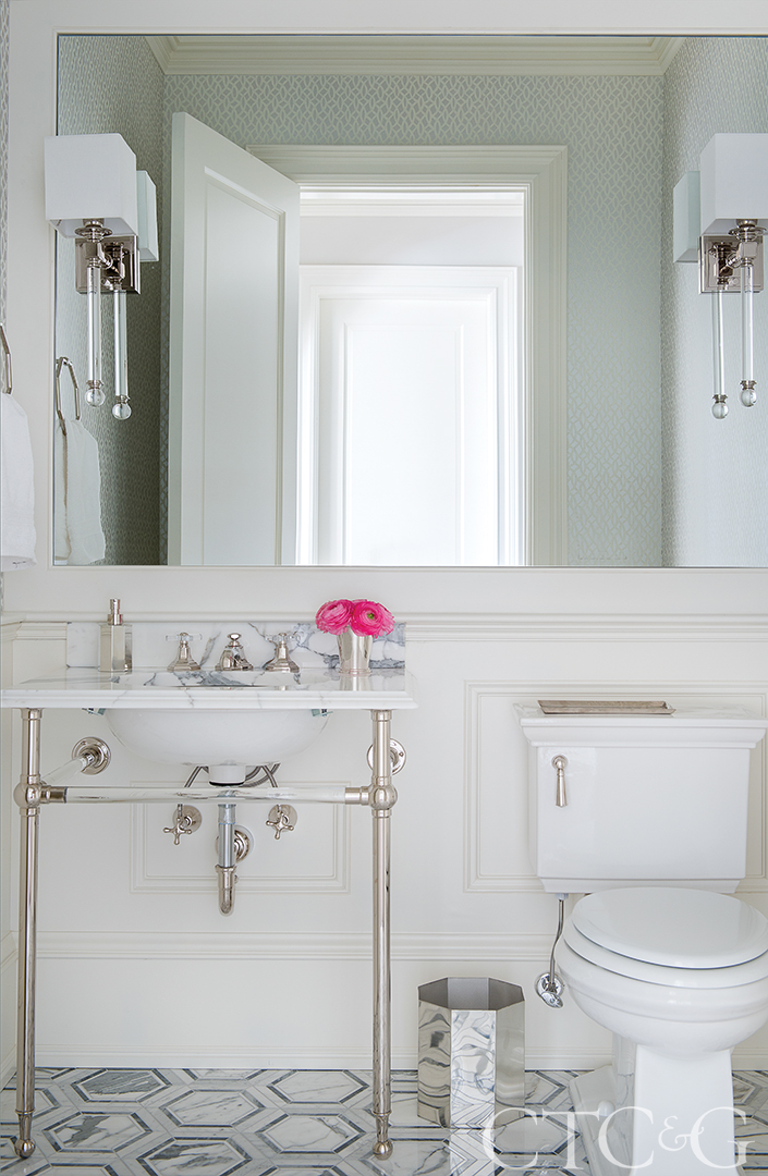 The play of pattern underfoot steals the show in this bath. The oversized hexagon tile “became the star of the room,” according to designer Michelle Morgan Harrison. She specified a subdued wallcovering to allow the tile to take center stage. Her trick for dark, windowless powder rooms—install a wall of mirror over the wainscoting.