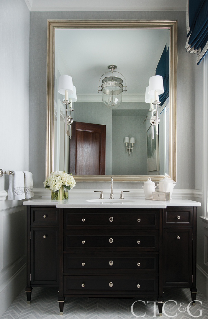 Christina Roughan of Roughan Interiors catered to her client’s chic style by selecting elegant furnishings with a touch of modern. Pattern was introduced with a marble floor in a chevron layout. “We took advantage of the high ceilings and created a jewel box of monochromatic blues, ivories and whites,” notes Roughan.