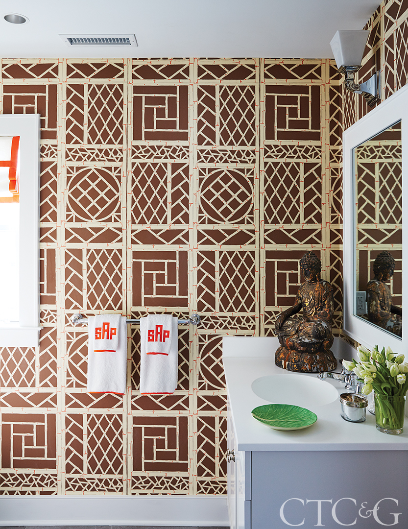 Sam Allen, of Sam Allen Interiors, describes his personal powder room as “East Coast classic gets an update with a dose of chinoiserie chic.” The subtle orange accent in the not-so-subtle bamboo lattice wallpaper is amped up in signature Allen style with detailing on the window treatment and monogrammed towels.