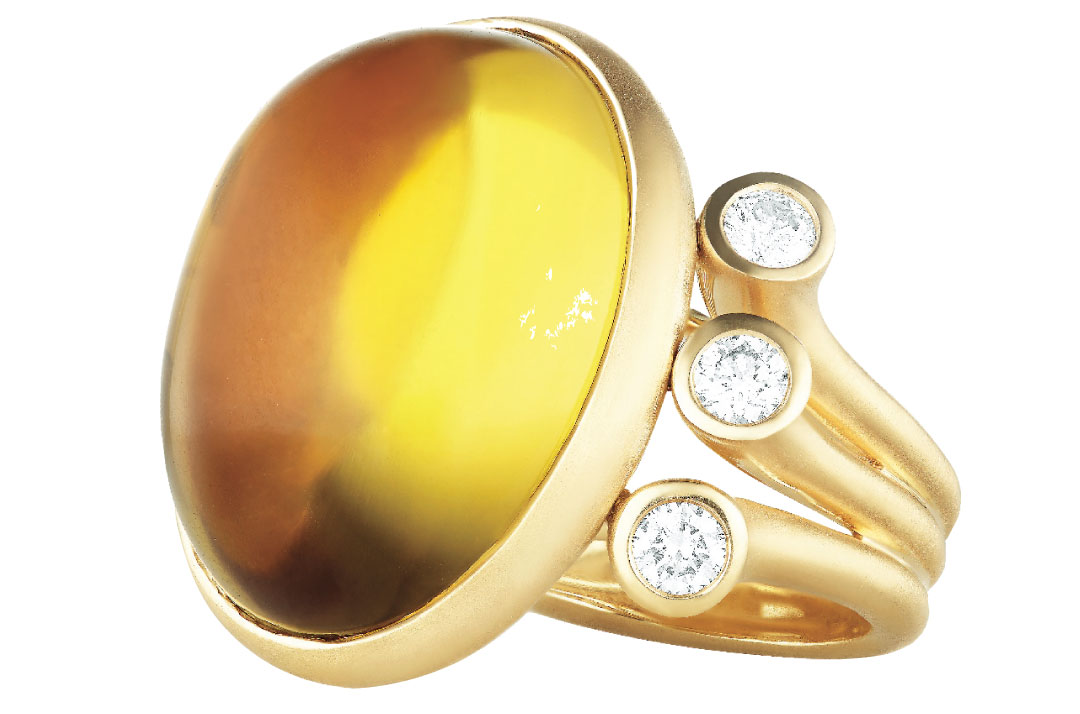 Carelle’s handcrafted Whirl yellow beryl cabochon bespoke ring with diamonds, 18k yellow gold. $12,750.