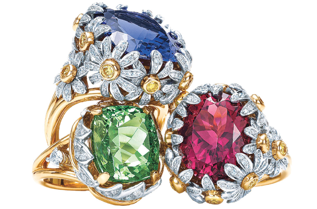 Trio of 18k gold and platinum daisy basket rings by Jean Schlumberger (clockwise from bottom left) diamond and green tourmaline, diamond and tanzanite, diamond and pink tourmaline. $37,000–$77,000, Tiffany & Co., Greenwich.