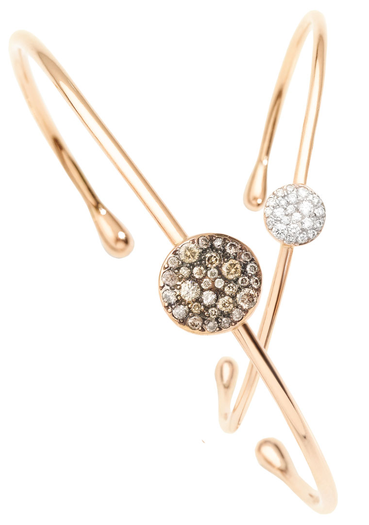 Pomellato’s Sabbia bracelets, 18k rose gold with brown diamonds (left) and 18k rose gold with white diamonds (right). $3,300 each, Steven Fox, Greenwich.