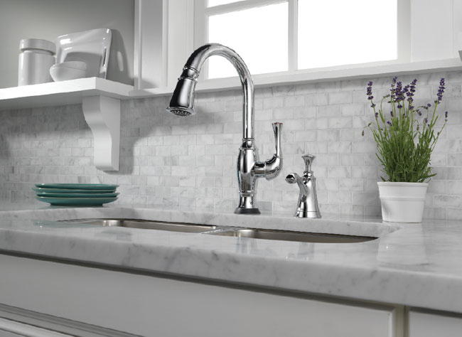 STREAMING TECHNOLOGY | Brizo’s Talo single-handle, pull-down kitchen faucet with SmartTouch® Technology has beauty and brains. The sleek design is available in four finishes and features a two-button, four-function pull-down wand and varied stream and volume control. $797-$1,033, Best Plumbing Tile & Stone, Stamford, 203-975-9448, bestplg.com.