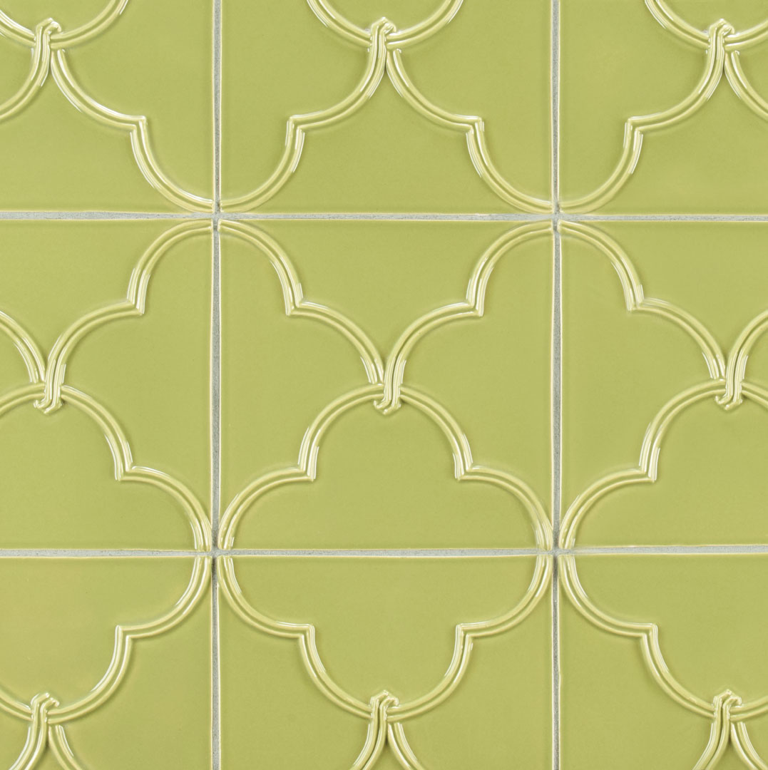 The graphic design of Ann Sacks’ Clover tile pops in a bright lime glaze. The glossy four-by-four-inch tile, from the Revival collection, is available in earthen or stoneware. $5.25 each.