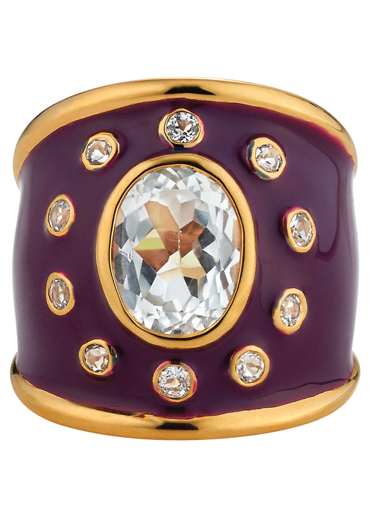 Inspired by a trip to Havana, Asha’s cigar-band ring in eggplant enamel, 14k vermeil and white topaz is sure to be noticed. $395.