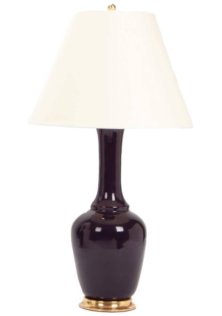 Retro and refined, the Alex lamp, a collaborative design with Alex Papachristidis for Christopher Spitzmiller, is dramatic as a stand-alone, or makes a perfect pair. The ceramic silhouette, in a rich gem-like purple glaze, is set on a 23k gold water gilt base. $3,995.