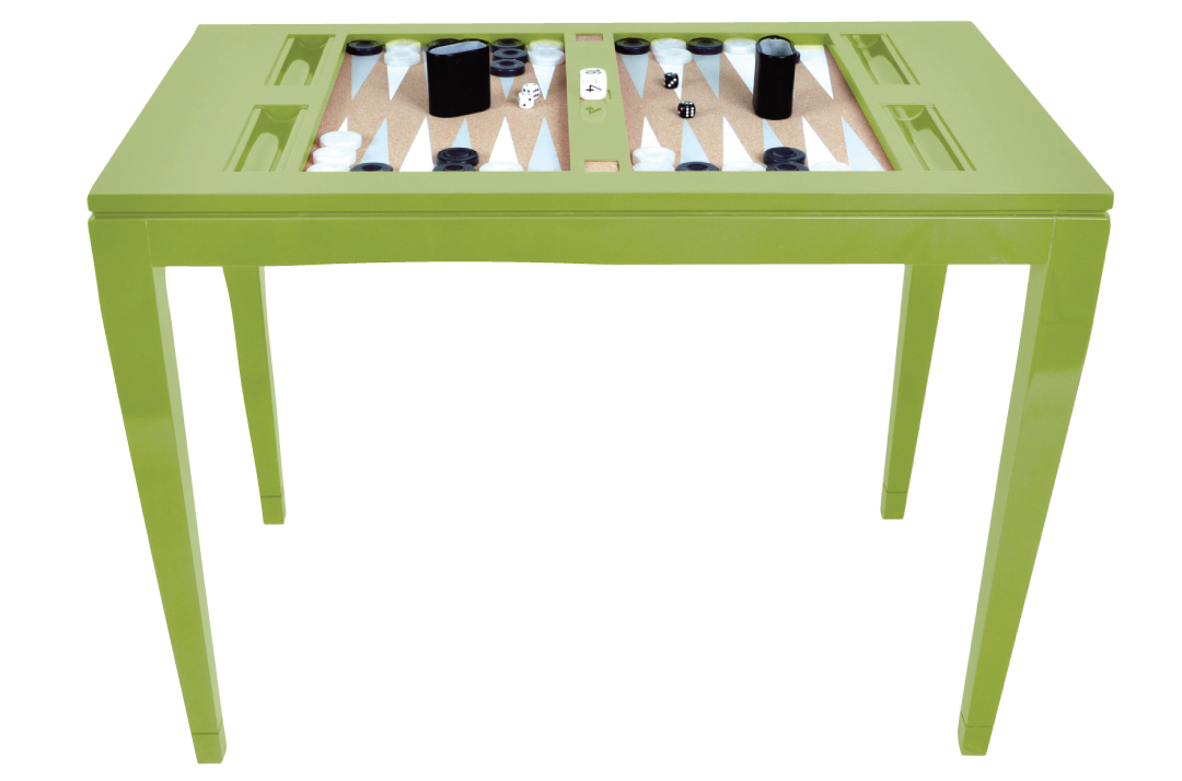 Backgammon, anyone? Lacquered in parakeet-green gloss, the Oomph table can be ordered in 16 colors with matching handpainted cork and game pieces. $3,995.