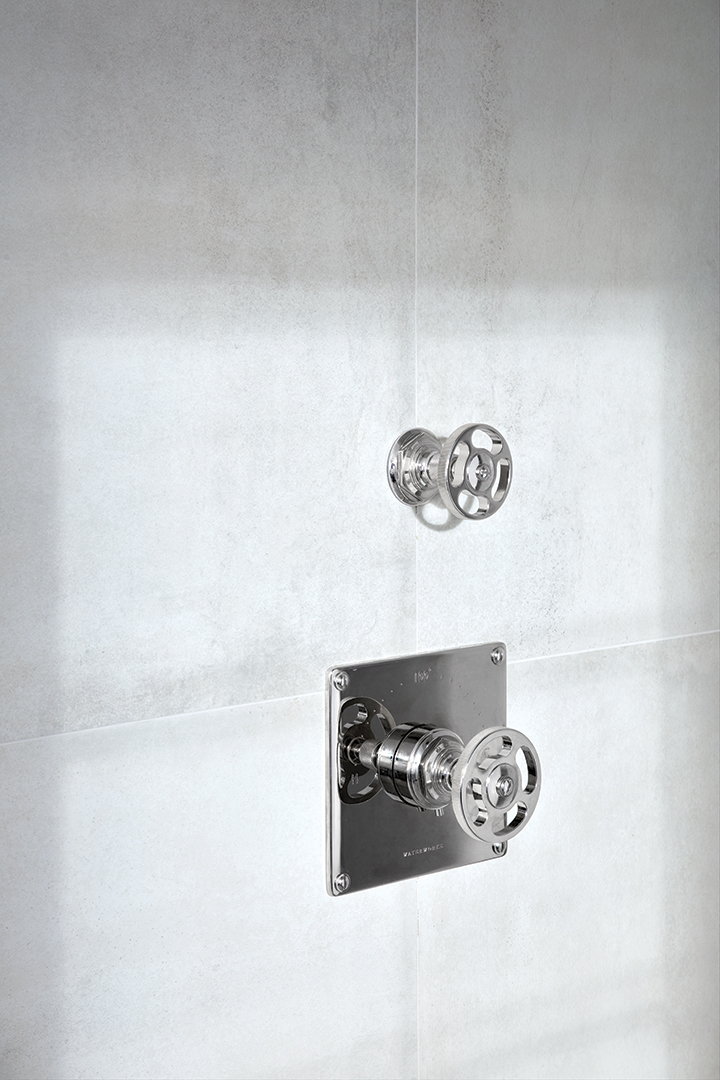 The simplicity of the glass vessel basin by Vitraform is juxtaposed with the industrial styling of the sink faucets and shower valves by R.W. Atlas for Waterworks. An RH printmaker’s vanity lends rustic warmth to the bathroom, accompanied by a Remains Lighting mirror and RH light fixture. The Italian tile, in a soft gray, is by Gambini.