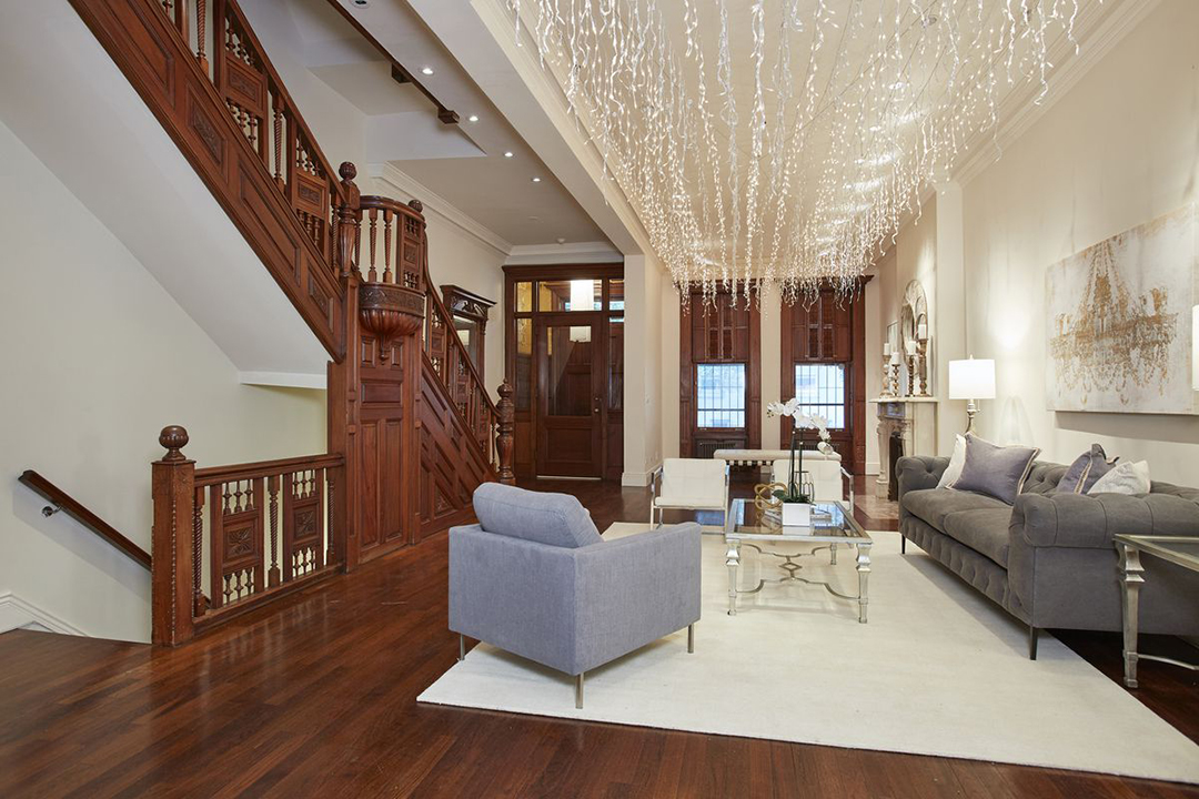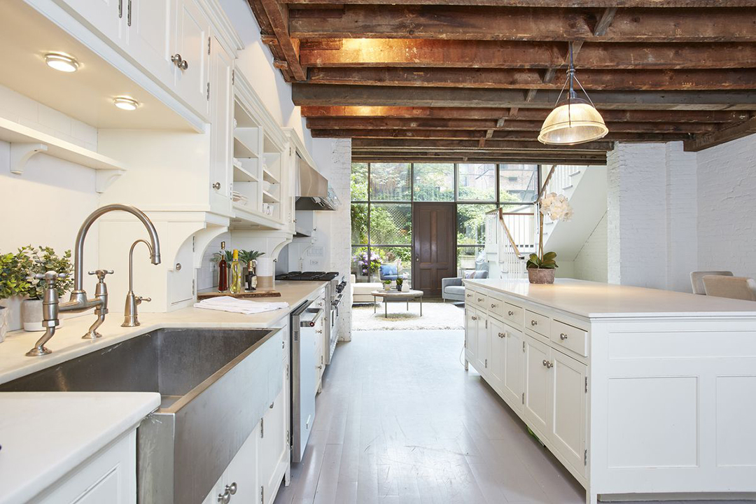 A turn-of-the-century townhouse, listed for $8.995 million, is turning heads on the Upper West Side for the melding of its original, classic features with some equally stunning updates. The home, which sits at 310 West 81st Street, boasts 5 bedrooms and 4.5 bathrooms within its impressive 4,600-square-foot floor plan. Most striking, however, is its eclectic, period-spanning charm.When antique homes undergo significant renovations, they run the risk of either losing their character or becoming an awkward hodgepodge of different styles and sensibilities. This address has no such issues, and its combination of old and new actually contribute significantly to its unique appeal. Dark wood is present throughout, shining most notably in the ornate carved bannisters of the grand staircase and in the gleaming hardwood floors. These rich, traditional details are offset by an abundance of natural light, brought in via a two-story wall of windows that display the private garden, and crisp, white walls.The home also retains its industrial style in places, with the original wood ceiling beams in the kitchen exposed to balance the clean aesthetic of the kitchen. Exposed brick walls in both the kitchen and living spaces are cleaned up with a coat of paint.Contemporary touches hardly hinder the residence’s grandeur, but instead elevate the depth of the design. Intricate woodwork, 10-foot ceilings, and original country house doors mingle deliciously with a brand new, custom chef’s kitchen and remarkably modern, luxe light fixtures in the formal living room. A gem of the past brought delicately into the present, this townhouse listed with Brown Harris Stevens is a special New York find.