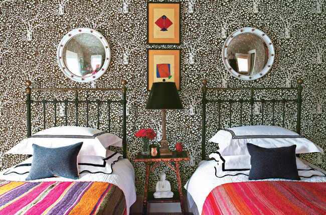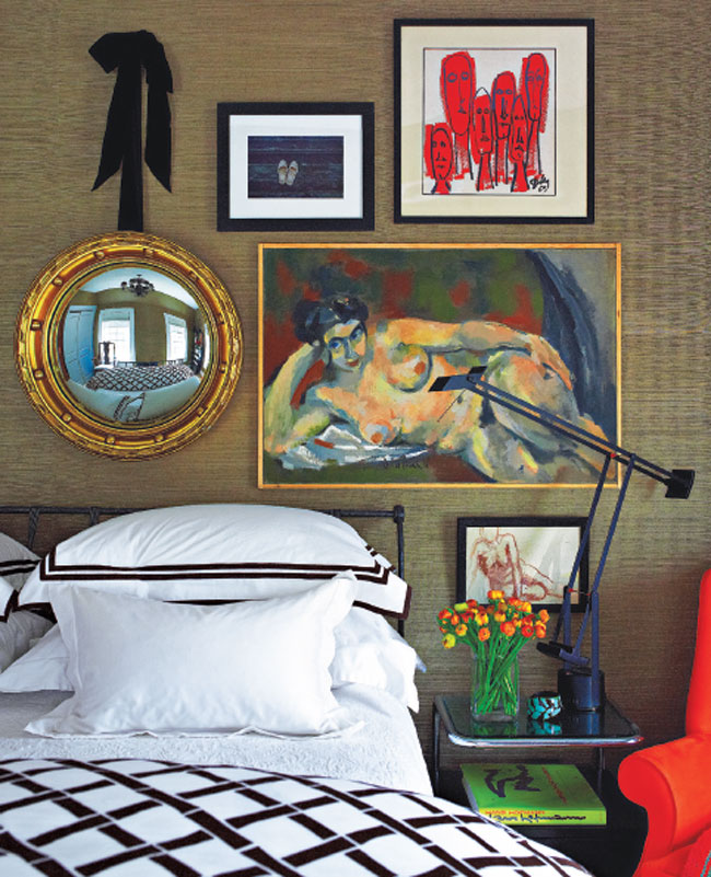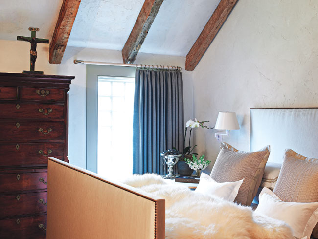 Upstairs, some of the owner’s existing furniture was used in each room. “I wanted to give the bedrooms a sense of family history,” says Mele. He re-covered chairs and reframed existing prints while adding new bedding and throws. The master bedroom has a bed designed with Mark Alexander silk and bronze nail heads. Hinson sconces and a Michael Taylor floor lamp were added along with an antique black crucifix from the owner’s collection.