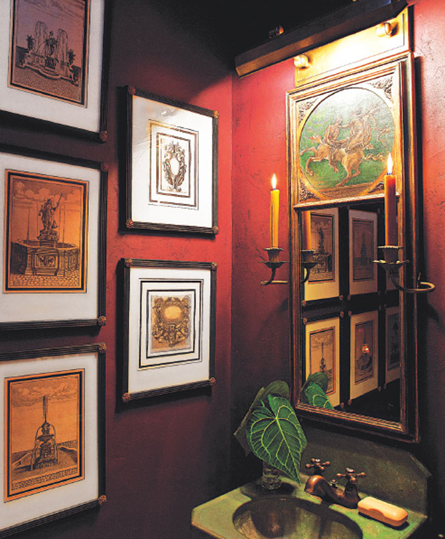 Once these changes were made, they were ready to combine furnishings, collections and paintings. First, Mele framed 25 separate prints of a Plan de Paris and hung them on the large wall at the top of the staircase as a nod to his client’s love of Paris. Next, the powder room was painted in Farrow & Ball Pelt, the homeowner’s favorite color, and a series of black and white French fountain plates were hung on the wall alongside a Juan Bastos portrait of the homeowner. A small antique washbasin was found in a garden sale in Bedford, NY, and a French trumeau mirror was purchased at Leonce Antiques in Westport.