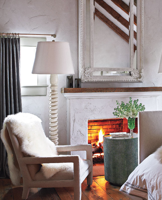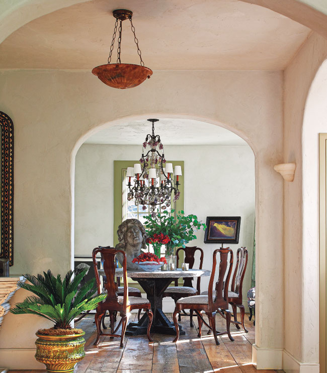 In the dining room, Ralph Lauren black-and-white cotton ticking was added to the owner’s original George I mahogany chairs. And the base of a Belgian bluestone table was stained a rich dark brown. Two sideboard tables from the Patrick Mele furniture collection and mirrors with a Greek key motif complete the room. New French doors open the kitchen onto a courtyard with a fountain and an outdoor fireplace. A custom chandelier hangs above the kitchen island, topped with honed Arabescato Orobico marble. Throughout the house, trim and windows were painted in Farrow & Ball London Stone. “I left the natural plaster walls in an effort to reinforce the historic quality of the architecture,” notes Mele.