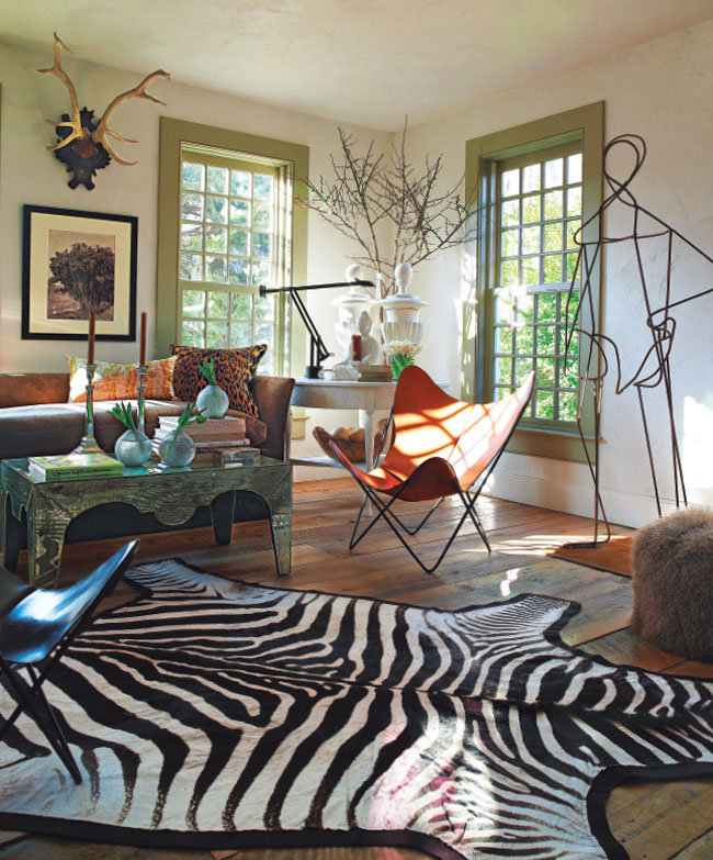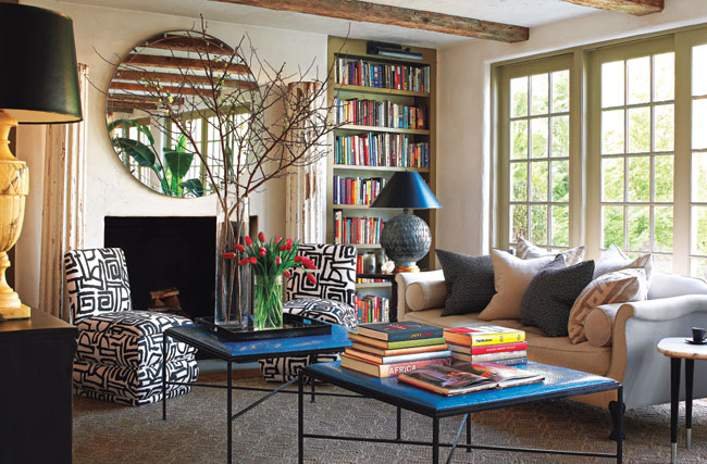 Although the charming Colonial was relatively new, Mele and his client decided to make some small structural changes before the real decorating could begin. The home was rewired with new lighting, and a digital sound system was installed, a priority for his client who loves to sing. A living-room fireplace was replaced with a custom mantleless hearth of honed black Nero Marquina marble, “in order to create more wall space to accommodate one of the owner’s many paintings,” explains Mele.