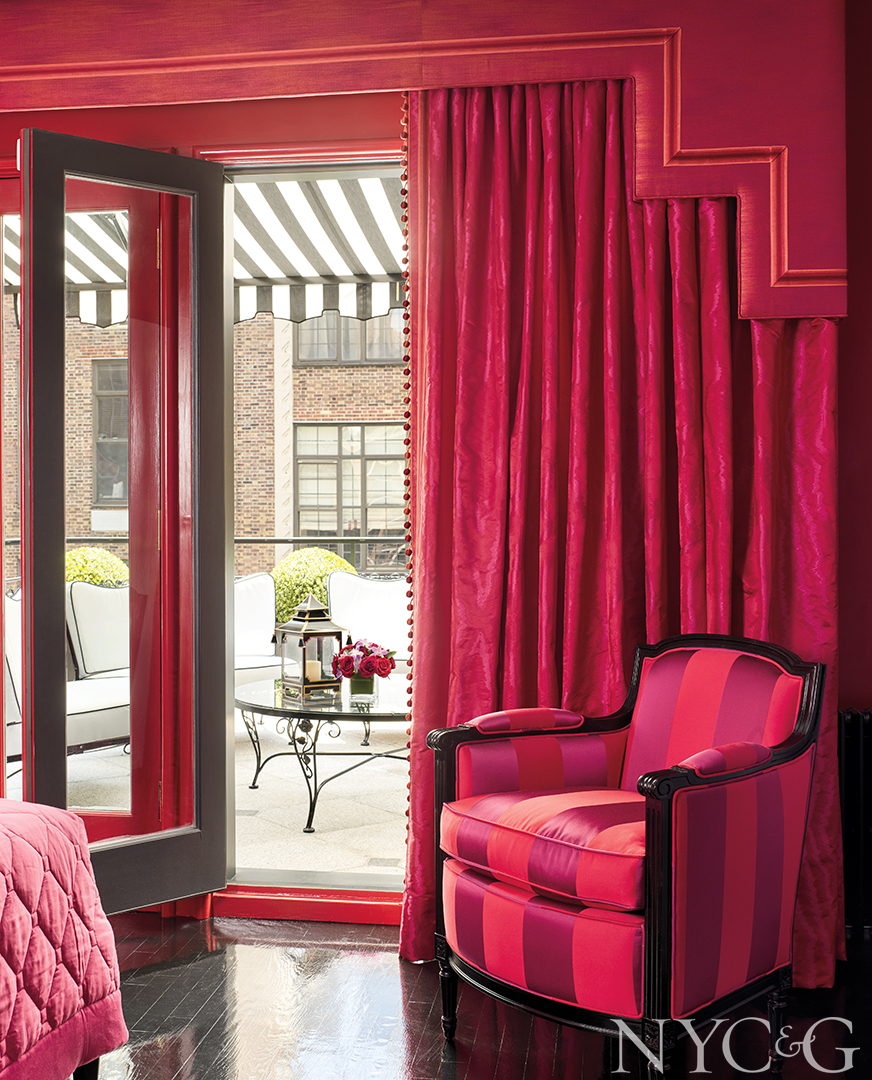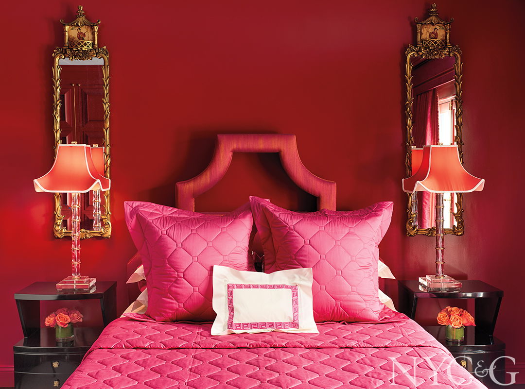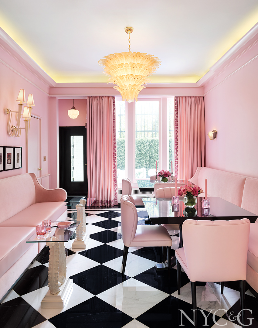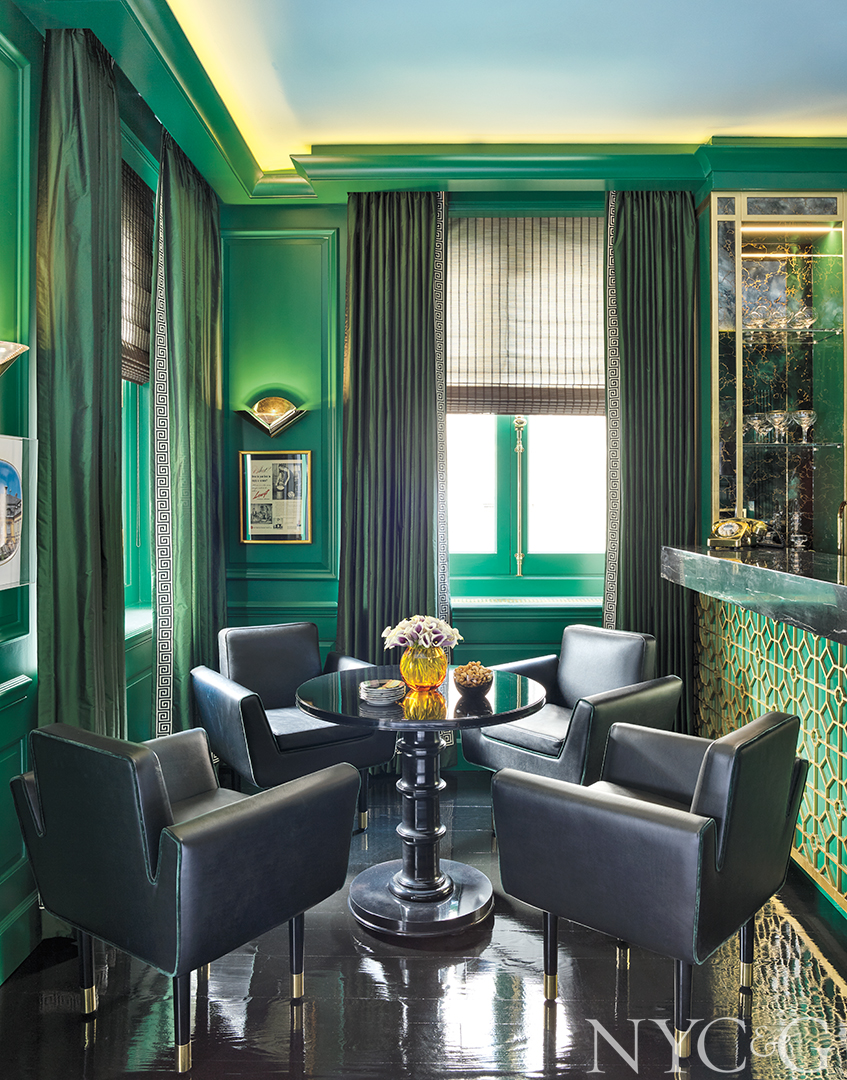 The highly collaborative clients also allowed the decorators “to do a lot of things, like use tons of colors,” Marra says, although the kitchen is intentionally appointed in tuxedo-sharp, monochromatic black and white, its reflective surfaces intended to maximize light in the sub-grade space. Upstairs, the emerald-green library includes a large bar with wood fretwork painted in 14k gold. The guest room’s palette was inspired by pagoda-shaped bright orange silk lampshades that the duo found at the Midtown shop Illumé. The pink of the dining room is the most telling homage to Draper, with deep banquettes covered in blush Naugahyde (the same pink appears in the elevator). Decked out in soothing gray, the bedroom in the master suite features an antique Dorothy Draper buffet, repurposed as a repository for the lady of the house’s shoes.